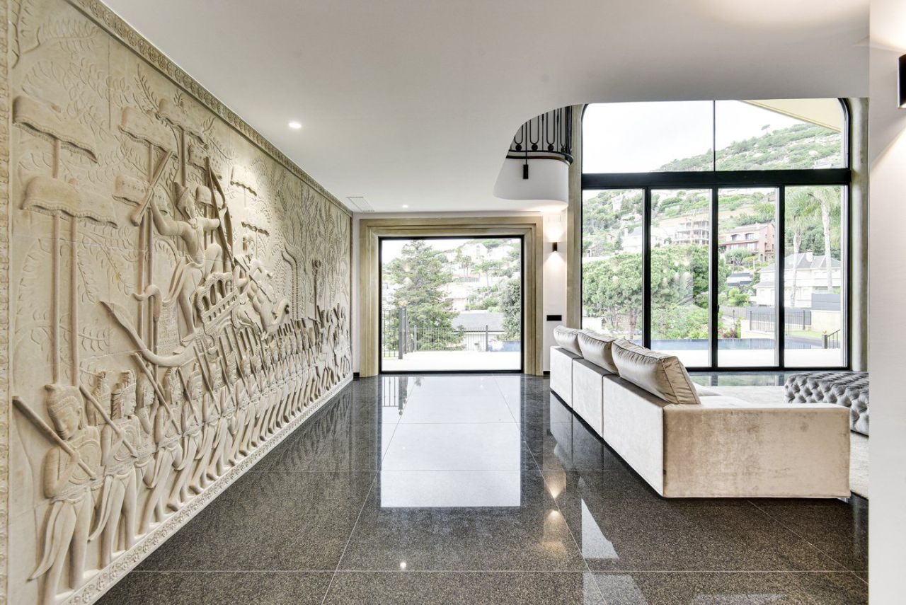 Посмотрите на эту красоту: это оригинальное каменное панно из Малайзии с множеством удивительных деталей. Переезжаем на кухню, где есть все: несколько холодильников, пара духовок, кухонный лифт, винный холодильник и другие необходимые вещи.