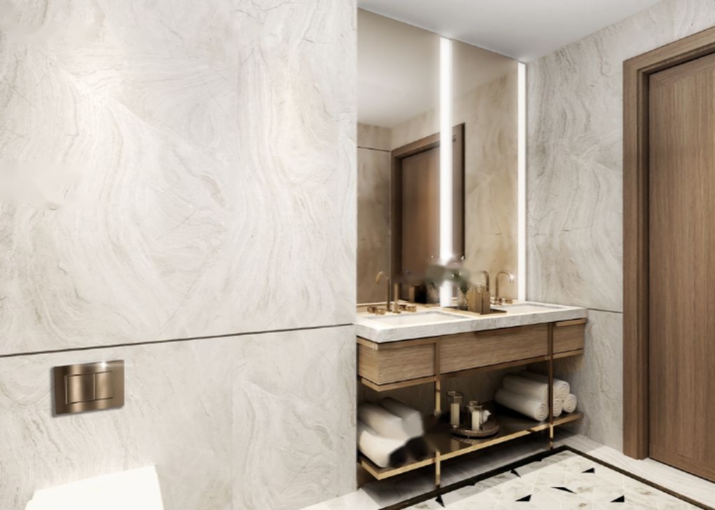 Квартира имеет прямой доступ на лифте, а интерьер выполнен в светлой и чистой цветовой гамме. Большая кухня оборудована каменными столешницами, бронзовыми и зеркальными фартуками и тщательно подобранной фурнитурой. Обеденная зона, идеально подходящая для приёма гостей, расположена рядом с просторной гостиной. Четыре спальни, каждая с собственной ванной комнатой, обеспечивают достаточное количество места для хранения, также есть отдельное помещение для персонала. Полы с подогревом проходят по всей квартире.