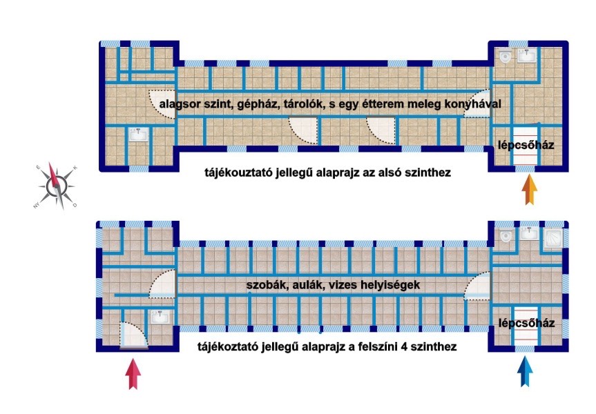 Более 150 комнат, заполняемость более, чем на 300 персон. На цокольном этаже расположены помещения, служившие ранее клубом и кафе. Часть цокольного этажа была сдана под ресторан - таким образом там имеются необходимые для горячей кухни система вытяжки, мощности водоснабжения и канализация.