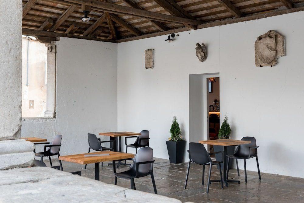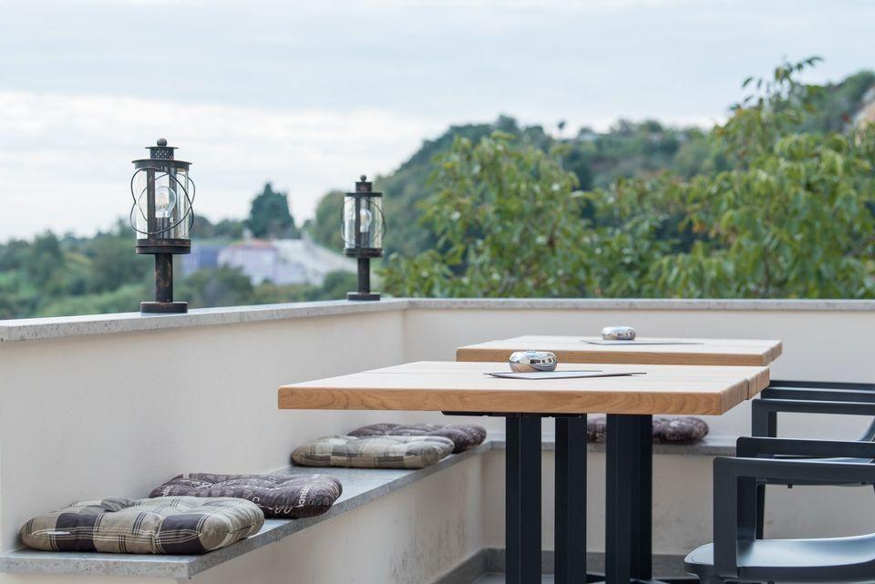 На первом этаже здания находится ресепшн, 2 туалета и лаунж-бар-кафе с 3 террасами, с которых открывается вид на старую площадь с одной стороны и море и Рабац с другой. Площадь террасы 120м2.